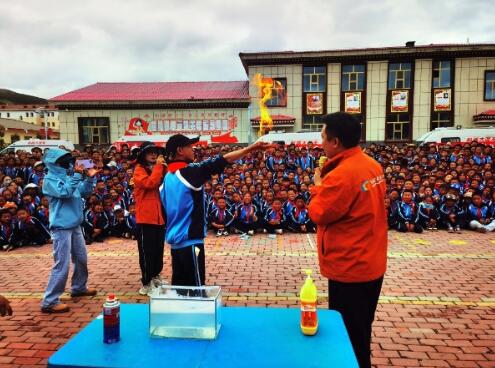Qinghai-Gansu-Sichuan mobile science vans team up along the Yellow River, letting students light a “fire in the palm” during a hands-on chemistry demo. (Photo credit: Qinghai Science and Technology Museum)