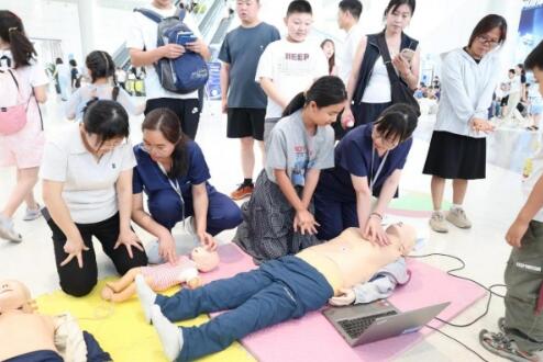 At the Children’s Health “Five-Small” summer outreach—tackling obesity, myopia, mental wellbeing, scoliosis and tooth decay—visitors roll up their sleeves to learn CPR techniques hands-on. (Photo credit: Henan Science and Technology Museum)