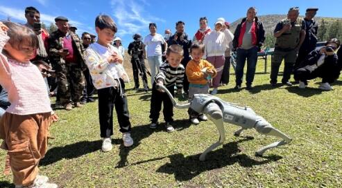 A Xinjiang mobile science van rolls all the way to the summer pastures of Taochagan Lake on the China–Mongolia border, where kids laugh and high-five a robo-dog under the open sky. (Photo credit: Xinjiang Science and Technology Museum)